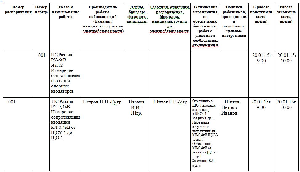 По просьбе постоянных читателей и где-то соавторов некоторых моих статей привожу ниже образец заполнения Журнала учета работ по нарядам-допускам и распоряжениям для работ в электроустановках при организации работ по измерениям сопротивления изоляции мегаомметром: